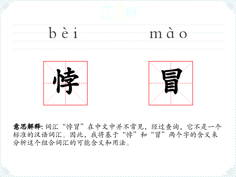 词汇“悖冒”在中文中并不常见,经过查询,它不是一个标准的汉语词汇。因此,我将基于“悖”和“冒”两个字的含义来分析这个组合词汇的可能含义和用法。
