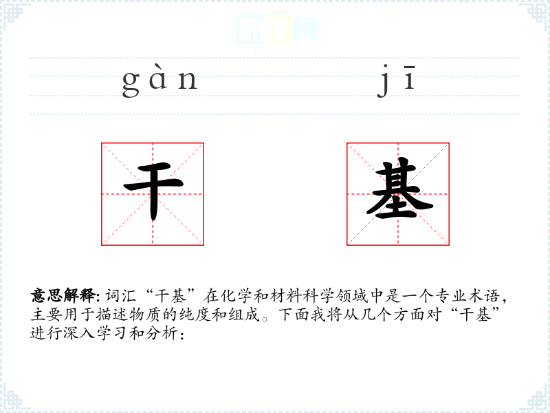 词汇“干基”在化学和材料科学领域中是一个专业术语,主要用于描述物质的纯度和组成。下面我将从几个方面对“干基”进行深入学习和分析: