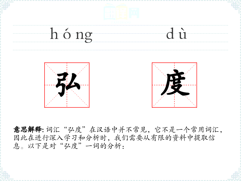 词汇“弘度”在汉语中并不常见,它不是一个常用词汇,因此在进行深入学*和分析时,我们需要从有限的资料中提取信息。以下是对“弘度”一词的分析: