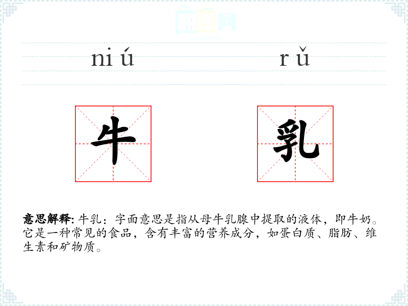 牛乳:字面意思是指从母牛乳腺中提取的液体,即牛奶。它是一种常见的食品,含有丰富的营养成分,如蛋白质、脂肪、维生素和矿物质。