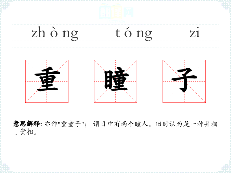 亦作"重童子"; 谓目中有两个瞳人。旧时认为是一种异相﹑贵相。