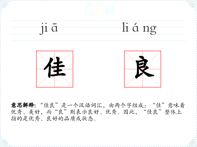 “佳良”是一个汉语词汇,由两个字组成:“佳”意味着优秀、美好,而“良”则表示良好、优秀。因此,“佳良”整体上指的是优秀、良好的品质或状态。