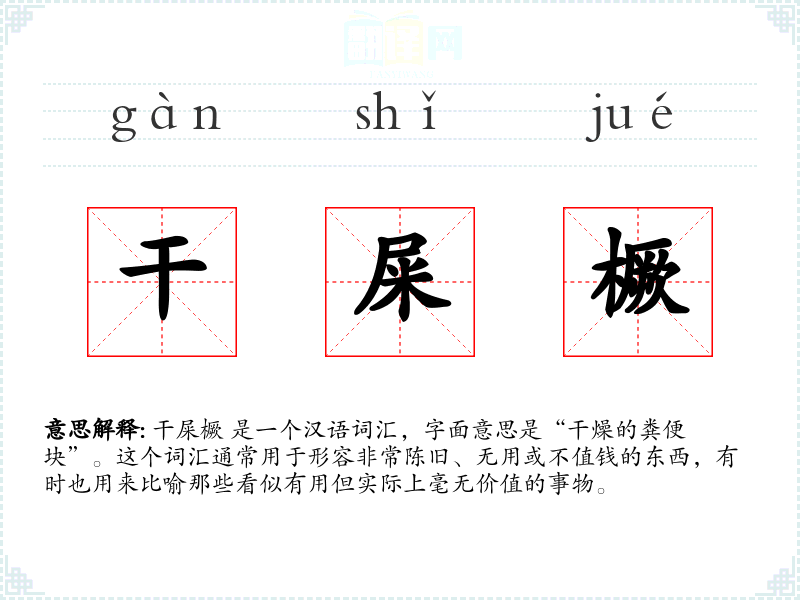 干屎橛 是一个汉语词汇,字面意思是“干燥的粪便块”。这个词汇通常用于形容非常陈旧、无用或不值钱的东西,有时也用来比喻那些看似有用但实际上毫无价值的事物。
