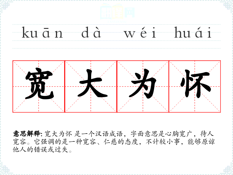 宽大为怀 是一个汉语成语,字面意思是心胸宽广,待人宽容。它强调的是一种宽容、仁慈的态度,不计较小事,能够原谅他人的错误或过失。