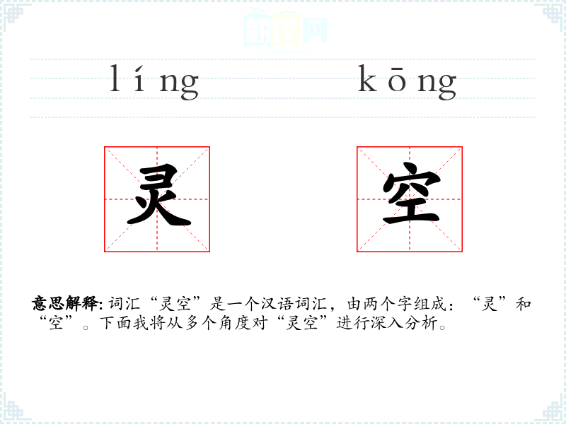 “灵”字在古代汉语中有多重含义,包括灵魂、灵性、灵巧等。“空”字则常指空旷、空无。两者结合,形成了“灵空”这一词汇,强调一种精神上的纯净和超脱。
