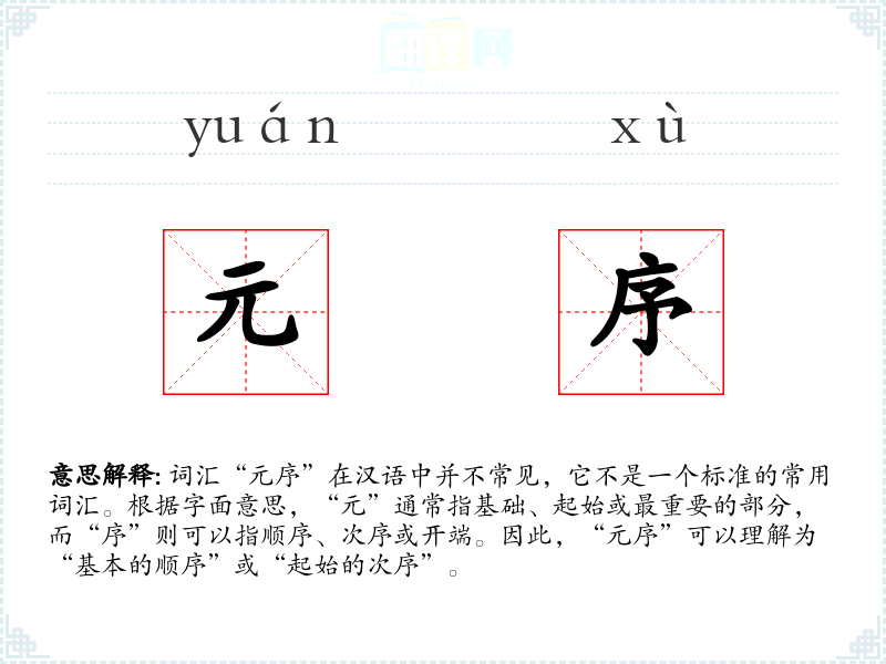 词汇“元序”在汉语中并不常见,它不是一个标准的常用词汇。根据字面意思,“元”通常指基础、起始或最重要的部分,而“序”则可以指顺序、次序或开端。因此,“元序”可以理解为“基本的顺序”或“起始的次序”。