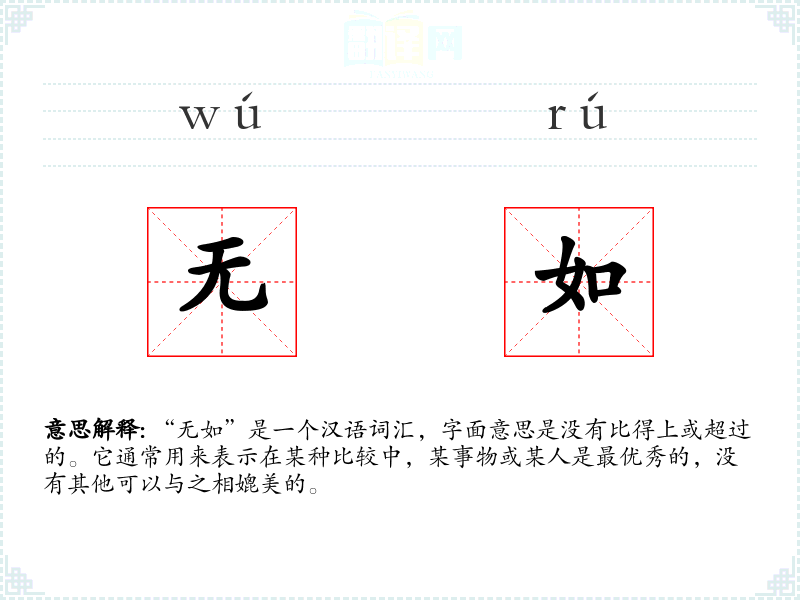 “无如”是一个汉语词汇,字面意思是没有比得上或超过的。它通常用来表示在某种比较中,某事物或某人是最优秀的,没有其他可以与之相媲美的。