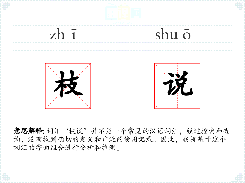 “枝说”字面意思可能是指关于树枝的论述或描述,或者是以树枝为比喻的某种说法。由于缺乏具体的使用实例,这个定义是推测性的。