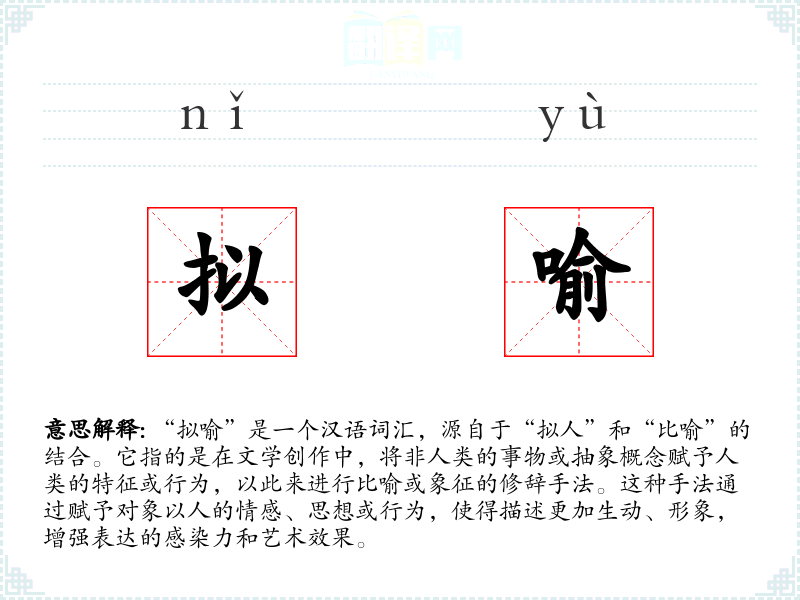 “拟喻”一词在中文中较为现代,结合了“拟人”和“比喻”的概念。在古代文学中,类似的修辞手法被称为“拟人”或“比喻”,随着语言的发展,“拟喻”这一词汇逐渐被用来更精确地描述这种结合了拟人和比喻的修辞手法。
