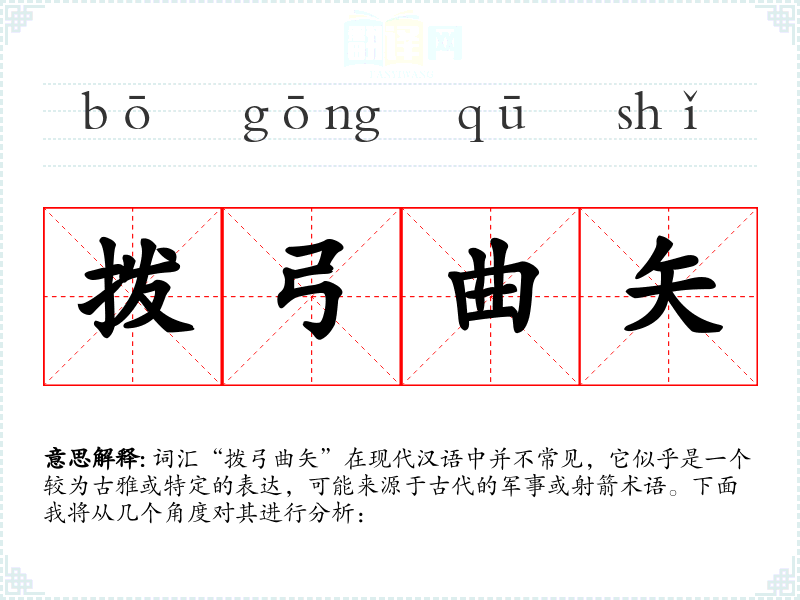 词汇“拨弓曲矢”在现代汉语中并不常见,它似乎是一个较为古雅或特定的表达,可能来源于古代的军事或射箭术语。下面我将从几个角度对其进行分析:
