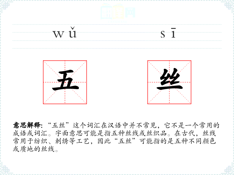 “五丝”这个词汇在汉语中并不常见,它不是一个常用的成语或词汇。字面意思可能是指五种丝线或丝织品。在古代,丝线常用于纺织、刺绣等工艺,因此“五丝”可能指的是五种不同颜色或质地的丝线。