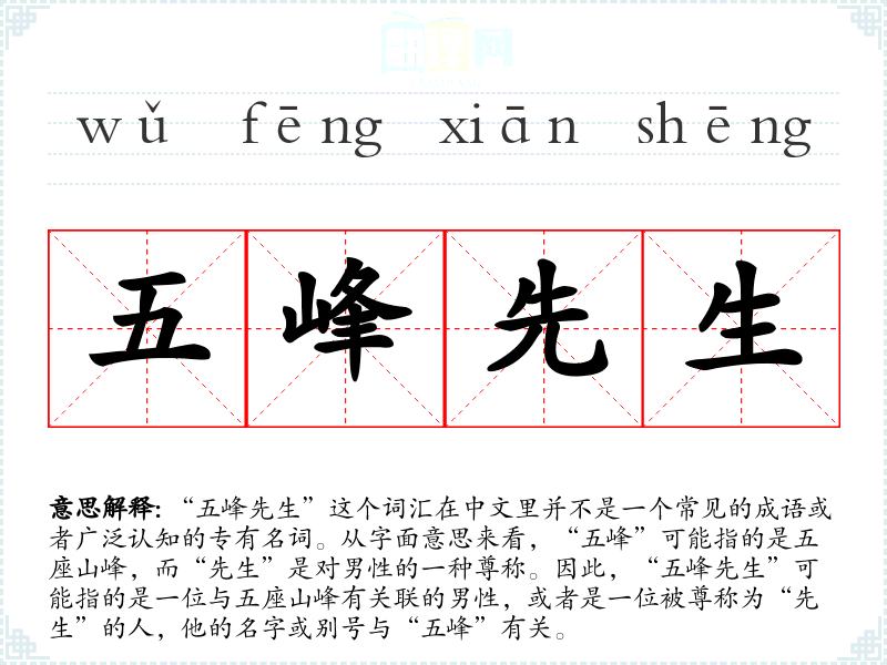 总的来说,“五峰先生”这个词汇在中文中并不是一个常见的词汇,它的使用和理解很大程度上取决于特定的语境和文化背景。在我的语言学习和表达中,它可能不是一个特别重要的词汇,但它展示了语言的创造性和多样性。