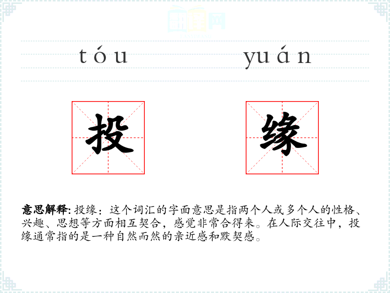 投缘:这个词汇的字面意思是指两个人或多个人的性格、兴趣、思想等方面相互契合,感觉非常合得来。在人际交往中,投缘通常指的是一种自然而然的亲近感和默契感。