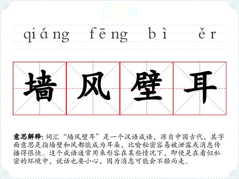 词汇“墙风壁耳”是一个汉语成语,源自中国古代,其字面意思是指墙壁和风都能成为耳朵,比喻秘密容易被泄露或消息传播得很快。这个成语通常用来形容在某些情况下,即使是在看似私密的环境中,说话也要小心,因为消息可能会不胫而走。