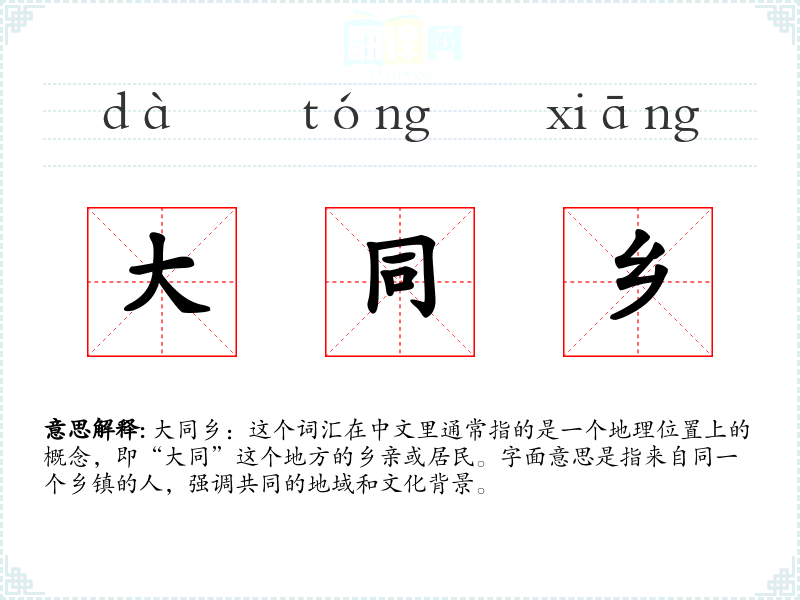 大同乡:这个词汇在中文里通常指的是一个地理位置上的概念,即“大同”这个地方的乡亲或居民。字面意思是指来自同一个乡镇的人,强调共同的地域和文化背景。