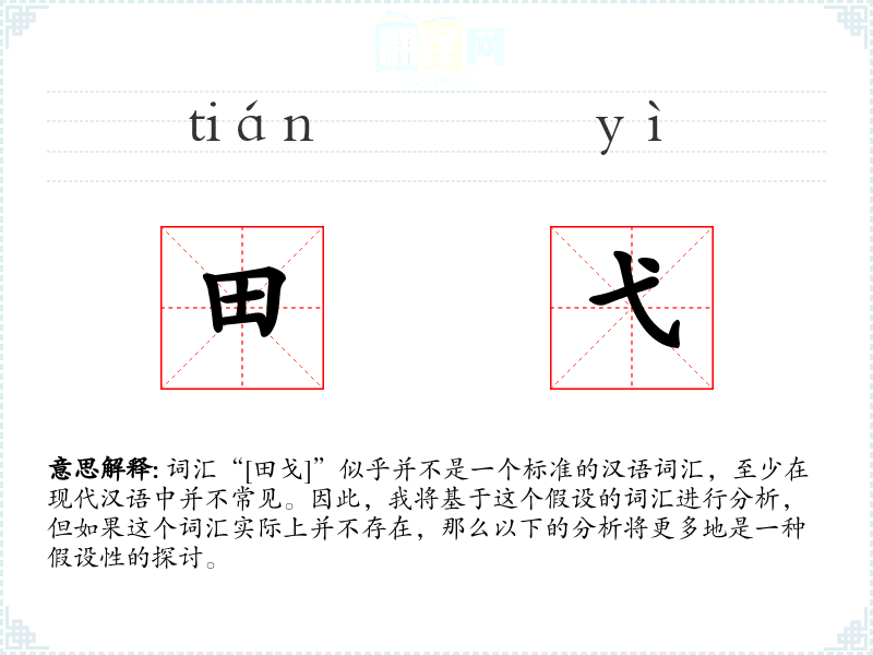 词汇“[田戈]”似乎并不是一个标准的汉语词汇,至少在现代汉语中并不常见。因此,我将基于这个假设的词汇进行分析,但如果这个词汇实际上并不存在,那么以下的分析将更多地是一种假设性的探讨。