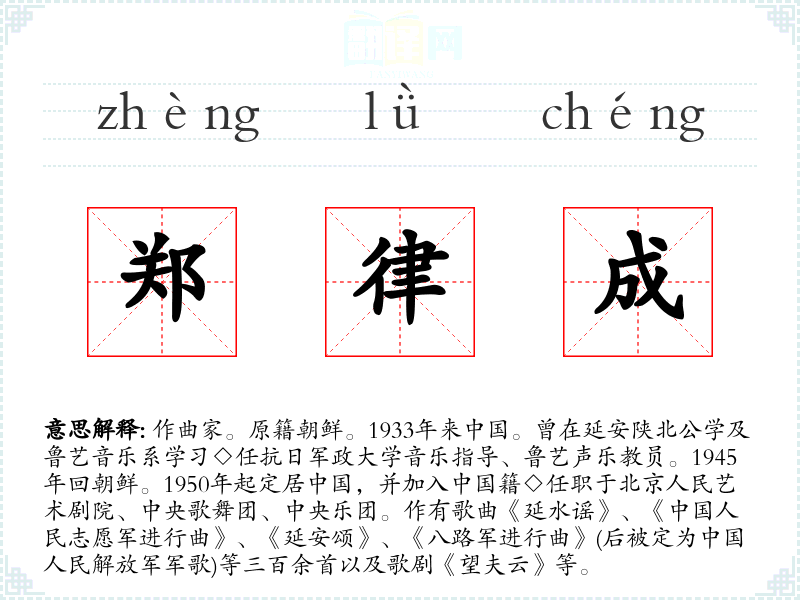 1.作曲家。原籍朝鲜。1933年来中国。曾在延安陕北公学及鲁艺音乐系学习◇任抗日军政大学音乐指导、鲁艺声乐教员。1945年回朝鲜。1950年起定居中国,并加入中国籍◇任职于北京人民艺术剧院、中央歌舞团、中央乐团。作有歌曲《延水谣》、《中国人民志愿军进行曲》、《延安颂》、《八路军进行曲》(后被定为中国人民解放军军歌)等三百余首以及歌剧《望夫云》等。