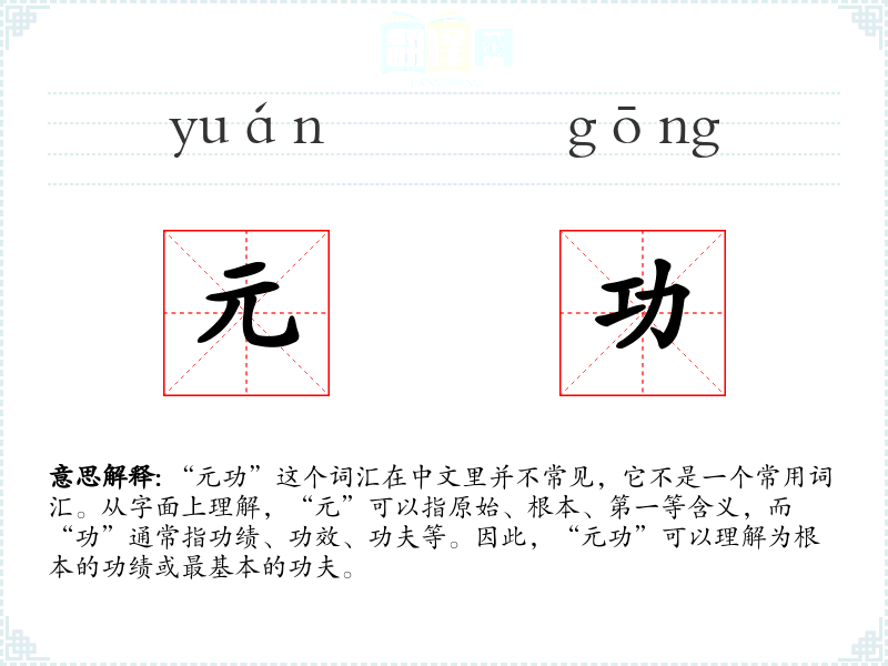 “元功”这个词汇在中文里并不常见,它不是一个常用词汇。从字面上理解,“元”可以指原始、根本、第一等含义,而“功”通常指功绩、功效、功夫等。因此,“元功”可以理解为根本的功绩或最基本的功夫。