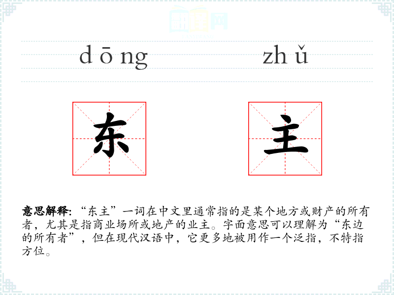 “东主”一词在中文里通常指的是某个地方或财产的所有者,尤其是指商业场所或地产的业主。字面意思可以理解为“东边的所有者”,但在现代汉语中,它更多地被用作一个泛指,不特指方位。