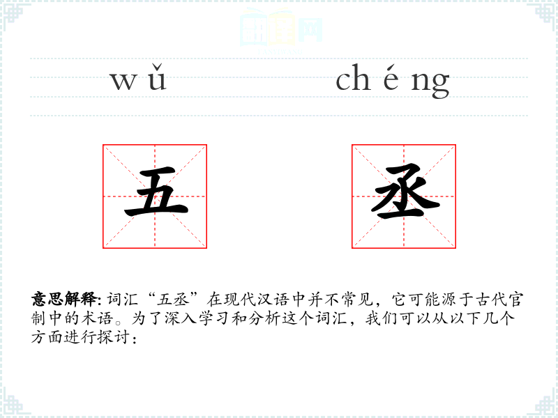 词汇“五丞”在现代汉语中并不常见,它可能源于古代官制中的术语。为了深入学*和分析这个词汇,我们可以从以下几个方面进行探讨: