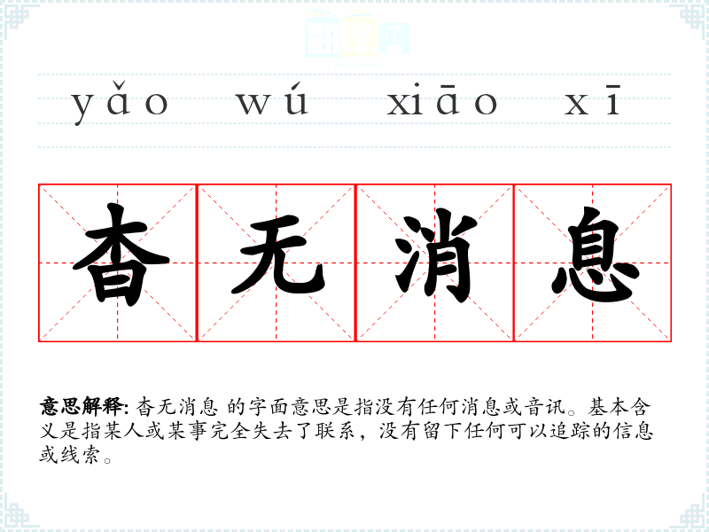 杳无消息 的字面意思是指没有任何消息或音讯。基本含义是指某人或某事完全失去了联系,没有留下任何可以追踪的信息或线索。