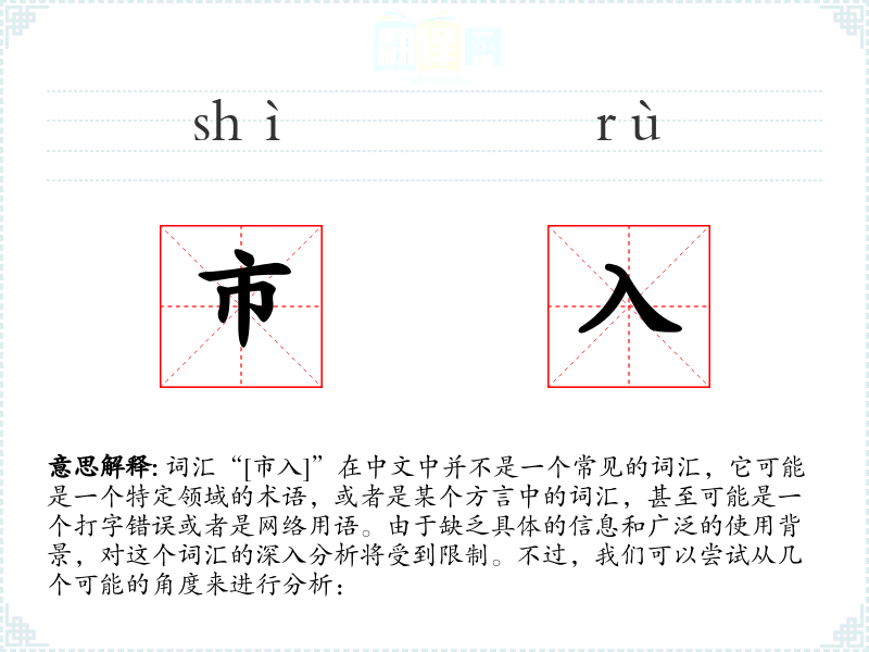由于“[市入]”不是一个标准的中文词汇,对其的分析非常有限。在语言学习和表达中,我们应该关注那些有明确定义和广泛使用的词汇,以确保沟通的准确性和有效性。如果“[市入]”是一个特定领域的术语,那么在学习和使用时应该参考该领域的专业资料和解释。