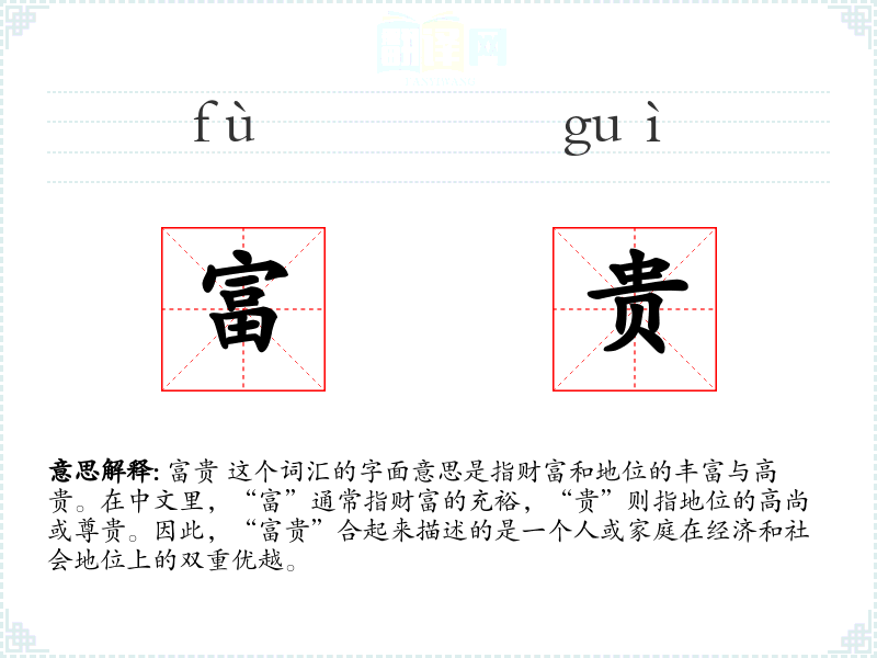 富贵 这个词汇的字面意思是指财富和地位的丰富与高贵。在中文里,“富”通常指财富的充裕,“贵”则指地位的高尚或尊贵。因此,“富贵”合起来描述的是一个人或家庭在经济和社会地位上的双重优越。