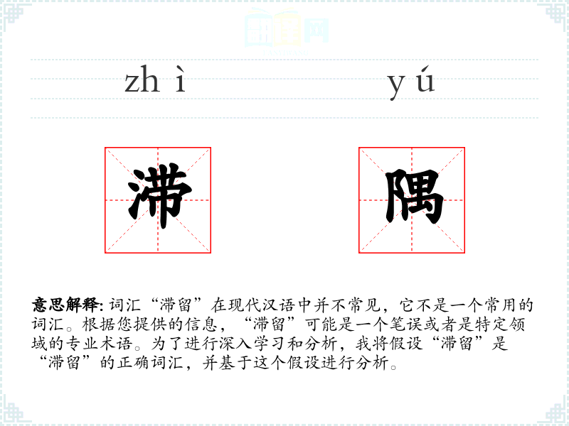 词汇“滞留”在现代汉语中并不常见,它不是一个常用的词汇。根据您提供的信息,“滞留”可能是一个笔误或者是特定领域的专业术语。为了进行深入学习和分析,我将假设“滞留”是“滞留”的正确词汇,并基于这个假设进行分析。