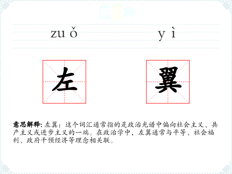 左翼:这个词汇通常指的是政治光谱中偏向社会主义、共产主义或进步主义的一端。在政治学中,左翼通常与平等、社会福利、政府干预经济等理念相关联。