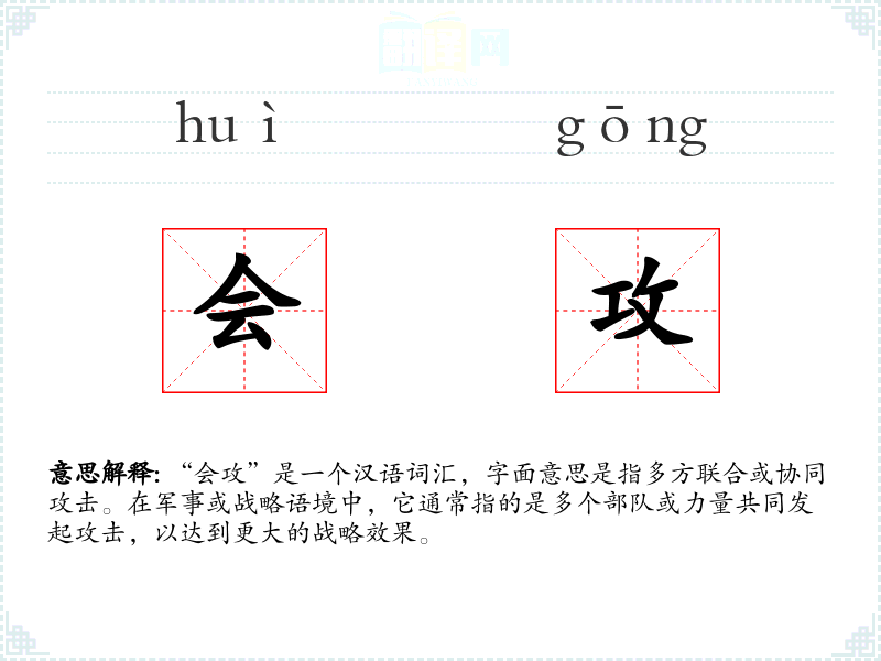 - 专业领域:在军事、战略规划或团队协作等专业领域,“会攻”是一个常用词汇,用于描述具体的战术行动或团队合作。