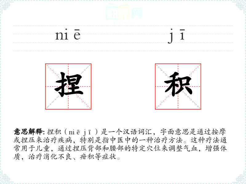捏积(niē jī)是一个汉语词汇,字面意思是通过按摩或捏压来治疗疾病,特别是指中医中的一种治疗方法。这种疗法通常用于儿童,通过捏压背部和腰部的特定穴位来调整气血,增强体质,治疗消化不良、疳积等症状。