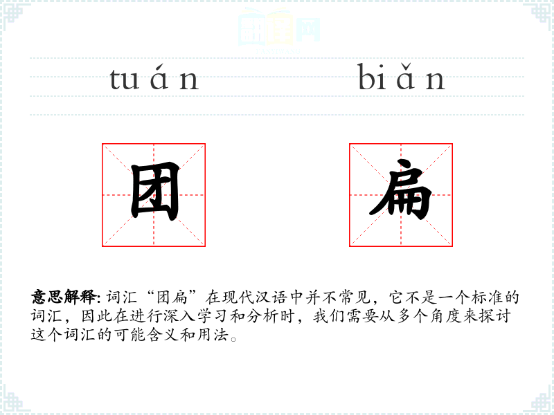 词汇“团扁”在现代汉语中并不常见,它不是一个标准的词汇,因此在进行深入学*和分析时,我们需要从多个角度来探讨这个词汇的可能含义和用法。