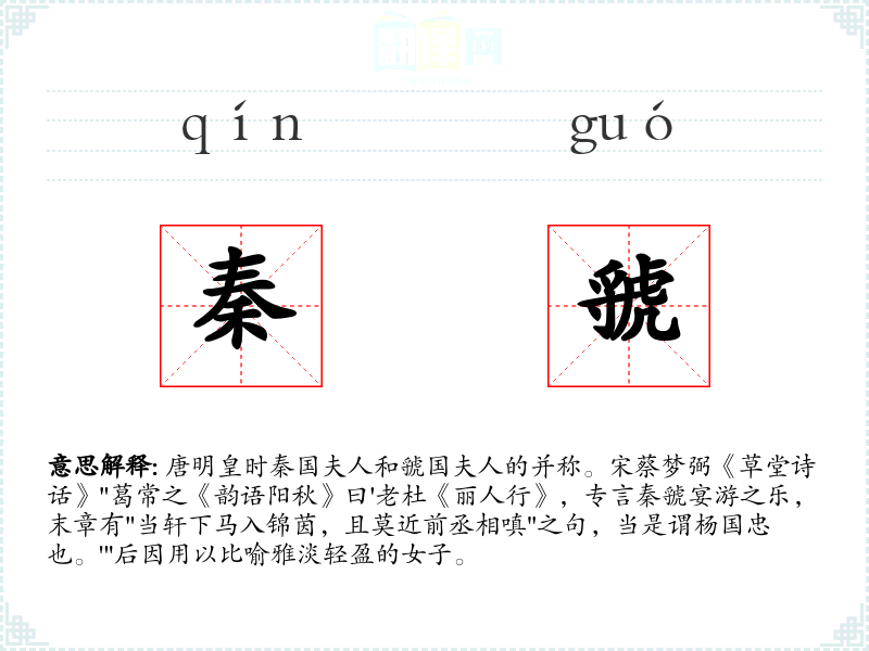 1.唐明皇时秦国夫人和虢国夫人的并称。宋蔡梦弼《草堂诗话》"葛常之《韵语阳秋》曰'老杜《丽人行》,专言秦虢宴游之乐,末章有"当轩下马入锦茵,且莫近前丞相嗔"之句,当是谓杨国忠也。'"后因用以比喻雅淡轻盈的女子。