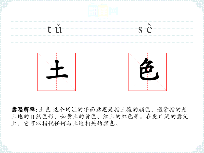 土色 这个词汇的字面意思是指土壤的颜色,通常指的是土地的自然色彩,如黄土的黄色、红土的红色等。在更广泛的意义上,它可以指代任何与土地相关的颜色。