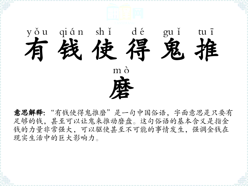“有钱使得鬼推磨”是一句**俗语,字面意思是只要有足够的钱,甚至可以让鬼来推动磨盘。这句俗语的基本含义是指金钱的力量非常强大,可以驱使甚至不可能的事情发生,强调金钱在现实生活中的巨大影响力。