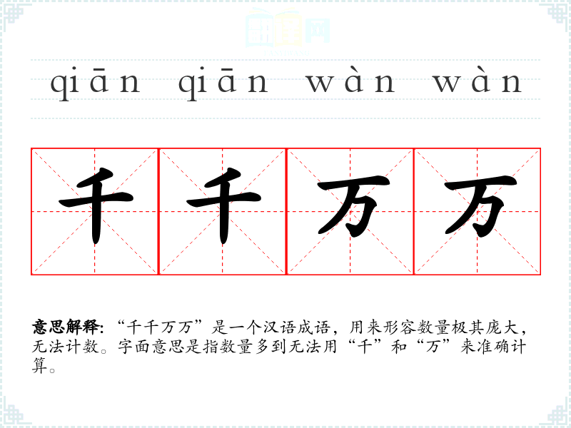 “千千万万”是一个汉语成语,用来形容数量极其庞大,无法计数。字面意思是指数量多到无法用“千”和“万”来准确计算。