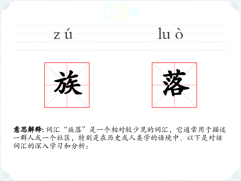 词汇“族落”是一个相对较少见的词汇,它通常用于描述一群人或一个社区,特别是在历史或人类学的语境中。以下是对该词汇的深入学习和分析: