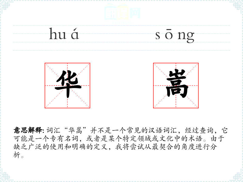 总结来说,由于“华嵩”不是一个常见的汉语词汇,我们无法提供一个全面的分析。它可能是一个专有名词,其意义和用法需要具体的上下文来确定。