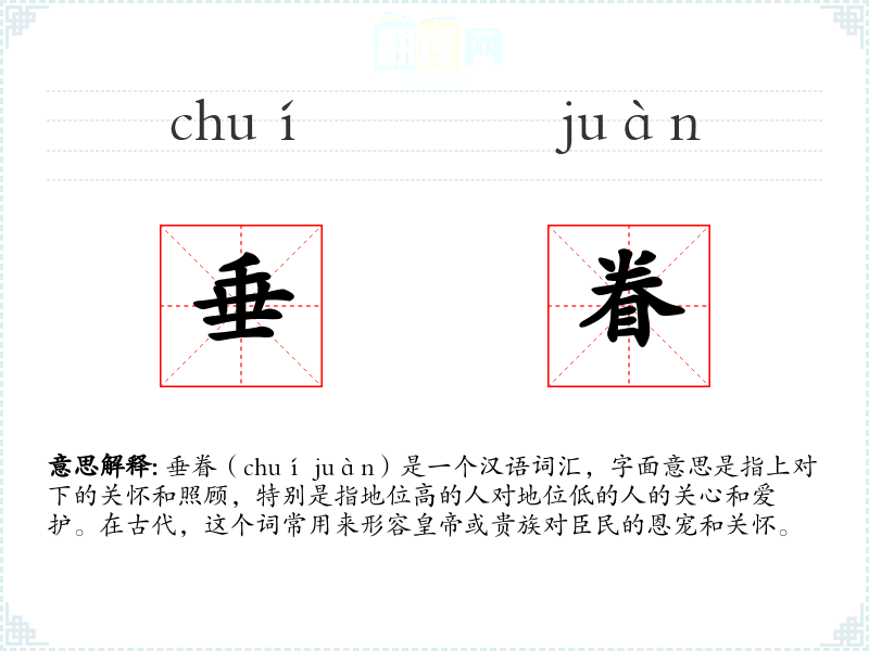 垂眷(chuí juàn)是一个汉语词汇,字面意思是指上对下的关怀和照顾,特别是指地位高的人对地位低的人的关心和爱护。在古代,这个词常用来形容**或贵族对臣民的恩宠和关怀。