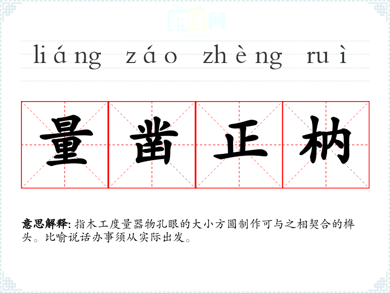 指木工度量器物孔眼的大小方圆制作可与之相契合的榫头。比喻说话办事须从实际出发。