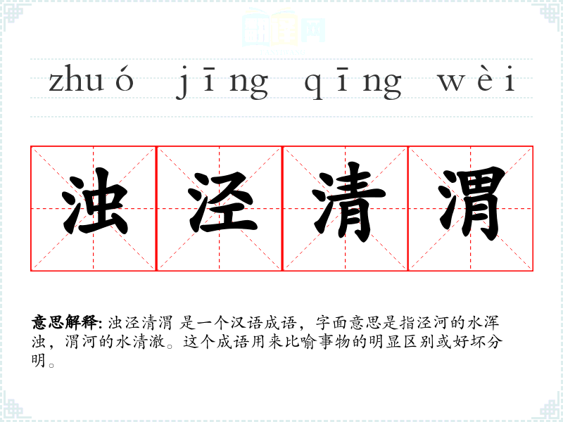 浊泾清渭 源自**古代的地理知识,泾河和渭河是两条流经陕西省的河流,泾河水质浑浊,渭河水质清澈。这个成语自古代就用来比喻事物的明显区别,至今仍在使用。