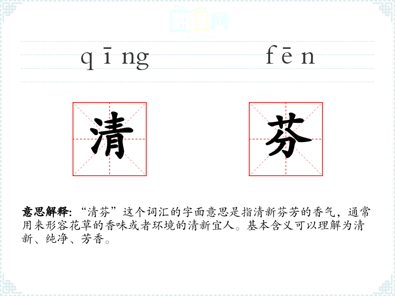 “清芬”这个词汇的字面意思是指清新芬芳的香气,通常用来形容花草的香味或者环境的清新宜人。基本含义可以理解为清新、纯净、芳香。
