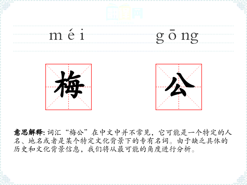 词汇“梅公”在中文中并不常见,它可能是一个特定的人名、地名或者是某个特定文化背景下的专有名词。由于缺乏具体的历史和文化背景信息,我们将从最可能的角度进行分析。