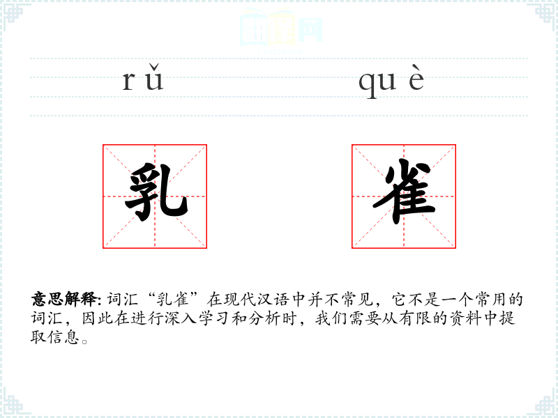 词汇“乳雀”在现代汉语中并不常见,它不是一个常用的词汇,因此在进行深入学*和分析时,我们需要从有限的资料中提取信息。