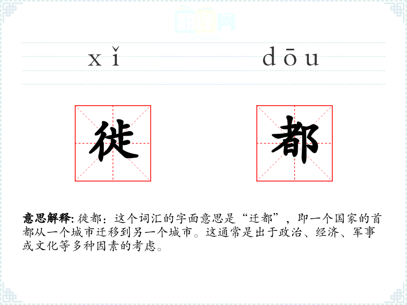 徙都:这个词汇的字面意思是“迁都”,即一个国家的首都从一个城市迁移到另一个城市。这通常是出于政治、经济、军事或文化等多种因素的考虑。