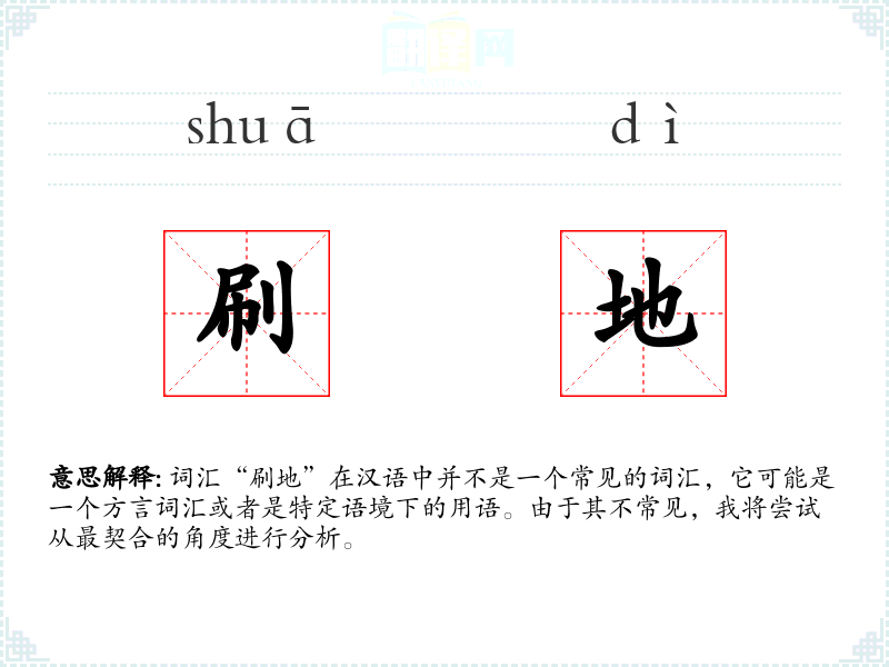 词汇“刷地”在汉语中并不是一个常见的词汇,它可能是一个方言词汇或者是特定语境下的用语。由于其不常见,我将尝试从最契合的角度进行分析。