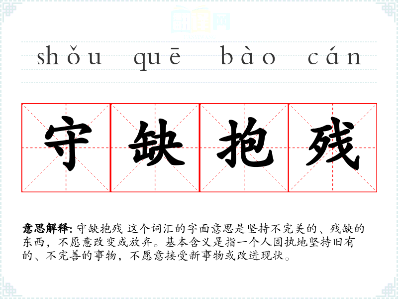 守缺抱残 这个词汇的字面意思是坚持不完美的、残缺的东西,不愿意改变或放弃。基本含义是指一个人固执地坚持旧有的、不完善的事物,不愿意接受新事物或改进现状。