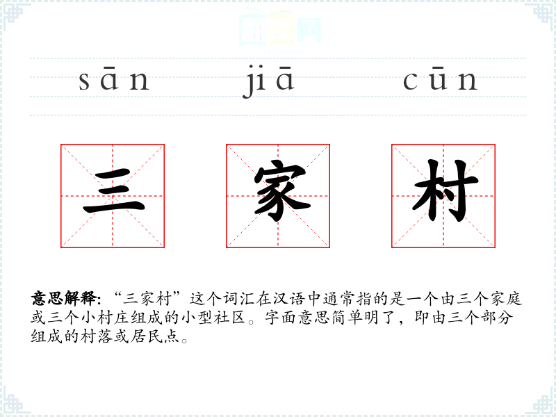 “三家村”这个词汇在汉语中通常指的是一个由三个家庭或三个小村庄组成的小型社区。字面意思简单明了,即由三个部分组成的村落或居民点。