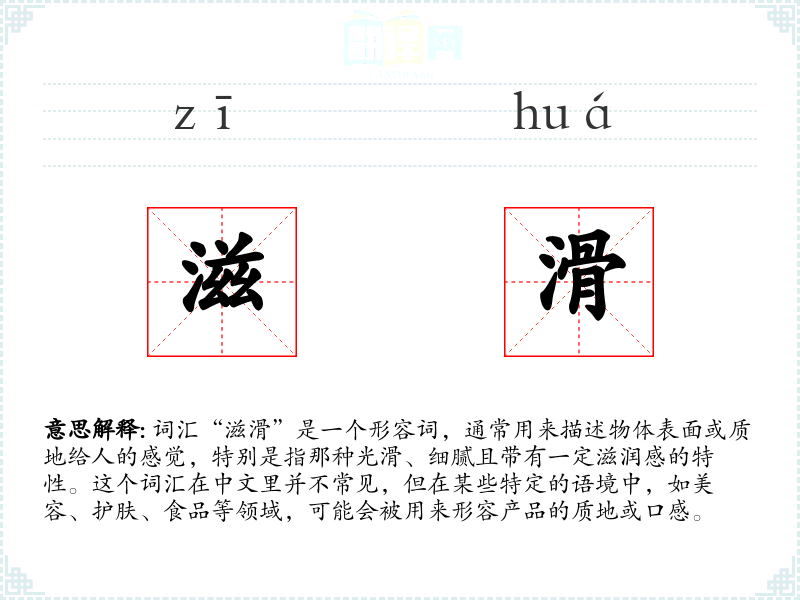 “滋滑”字面意思是指既滋润又光滑。其中,“滋”字常与“润”连用,表示滋润、滋养;“滑”字则表示光滑、不粗糙。