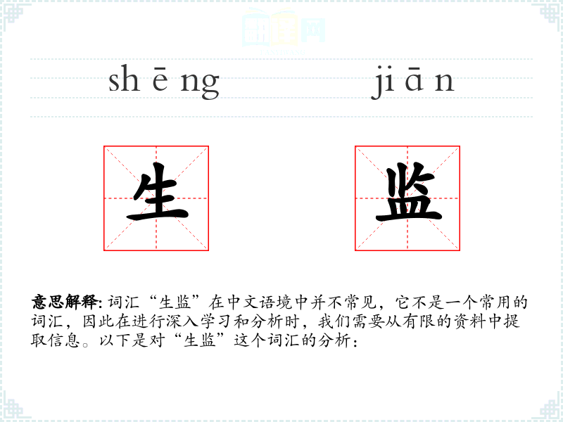 词汇“生监”在中文语境中并不常见,它不是一个常用的词汇,因此在进行深入学*和分析时,我们需要从有限的资料中提取信息。以下是对“生监”这个词汇的分析:
